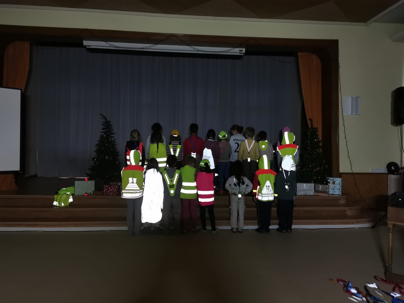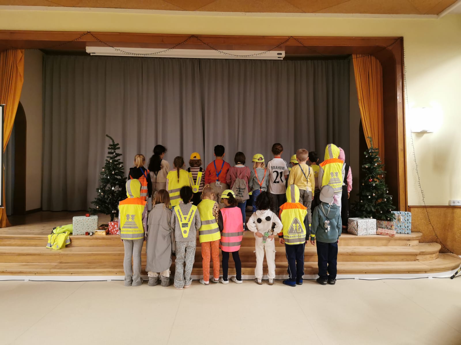 Alle Kinder der ersten Schuljahr durften dabei in der verdunkelten Aula sehr eindrücklich erleben, welch großen Unterschied die richtige Bekleidung macht. Jedes Kind wurde mit Warnwesten, Reflektoren, Mützen oder entsprechenden Rucksäcken ausgestattet und durfte bei den anderen Kindern sehen, wie gut sichtbar man mit solch einer Ausstattung ist.