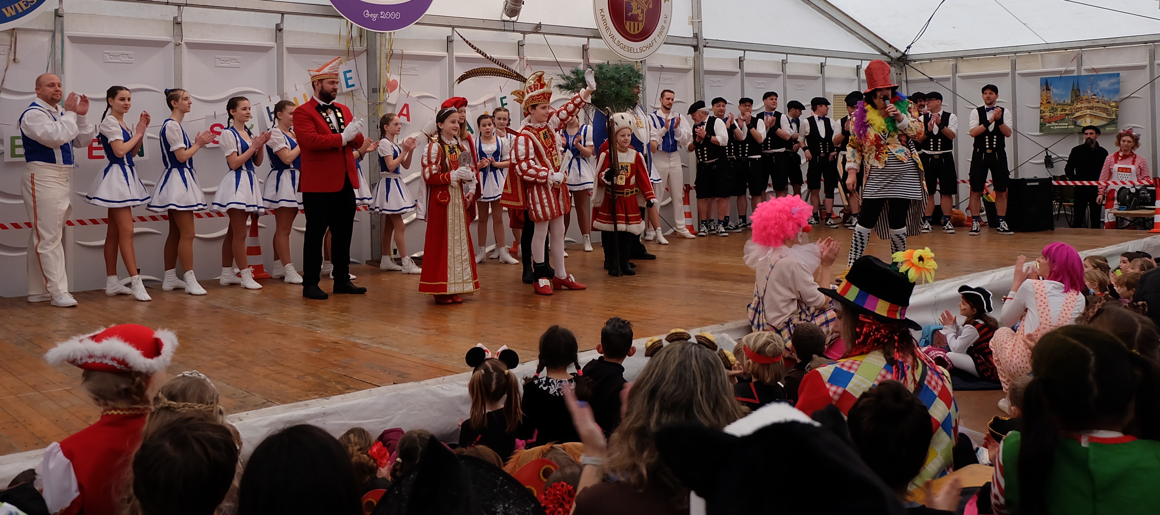 Und dann durften unsere Pänz selber Bühnenluft schnuppern. Da selbige wunderbar groß, unser Zeitfenster aber eher klein war, traten immer zwei bis drei Klassen zusammen auf und begeisterten die Zuschauer. Mit „Jetzt geht’s los“ der Klassen 2b, 2c, 2d wurde das Programm passend eröffnet. Weiter ging es mit den Klassen 1b und 1c die mit „Tante Rita“ tanzten und den weiteren zweiten Schuljahren, die zu „Viva Colonia“ performten. Sehr niedlich zeigten uns die Klassen 1a und 1d wie der Elefant in der Disko tanzt. Nun waren die jüngeren Jahrgänge fertig und haben ihre Sache wirklich toll gemacht. Die Klassen 4a und 4b zeigten uns „Wenn isch ne Engel bin“ mit vielen akrobatischen Einlagen. Da wurde unseren moderierenden Clowns sogar ganz schwindelig. Frau Ingenerf und Frau Deneke führten durchs Programm und die Stimmung war richtig gut. Ebenso schwungvoll ging es weiter mit dem Auftritt der 3c und 3d zu Polka Polka Polka bei dem eine tolle Seiltanzshow geboten wurde. Das Training für Skipping Heart hat sich gelohnt. Nun folgte ein Ohrwurm der diesigen Session: Mit „Oben, Unten“ machten die 4a und 4d nochmal richtig Stimmung. Den Abschluss machten die 3a und 3b mit einem stimmungsvollem Pyramiden-Tanz zu den Festpiraten.