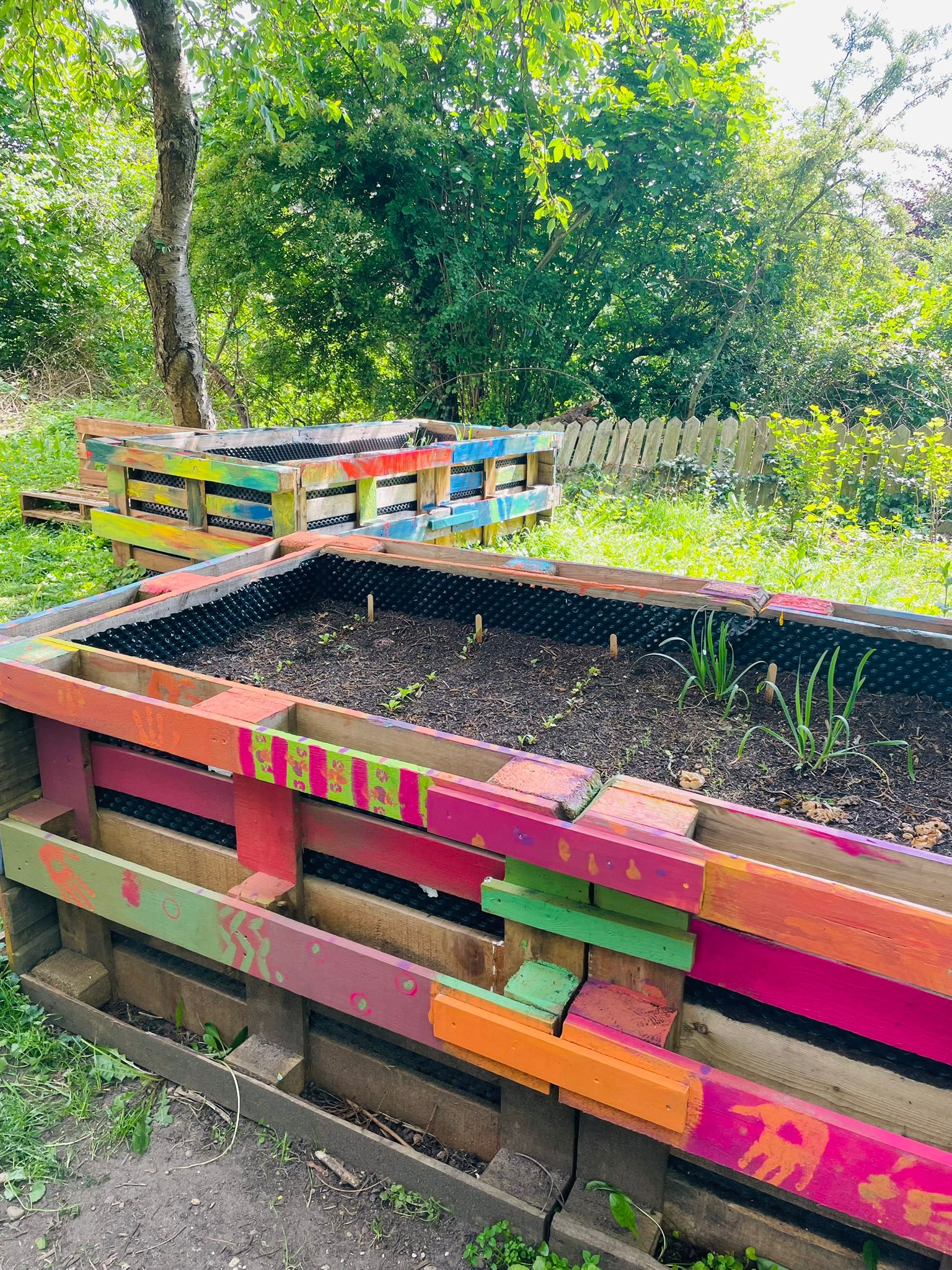 Zunächst wurden zwei große Hochbeete aus Paletten installiert. Den Aufbau und die Gestaltung der Hochbeete wurde von der Bau-AG vorgenommen. Die Befüllung der Beete übernahmen einige engagierte Eltern. Zur Bepflanzung und Pflege der Beete schreitet die Garten-AG unter Leitung von Frau Glück und Frau Mann zur Tat. Vielen Dank an alle, die dazu so toll beigetragen haben!